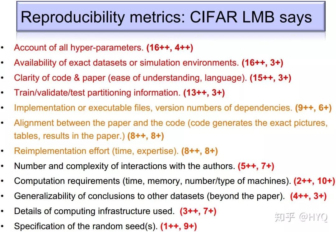 随后,针对DRL领域,Pineau展示了该研究组对当前不同DRL算法的大量可复现性实验。实验结果表明,不同DRL算法在不同任务、不同超参数、不同随机种子下的效果大相径庭。在报告后半段,Pineau呼吁学界关注“可复现性危机”这一问题,并根据她的调研结果,提出了12条检验算法“可复现性”的准则,宣布计划在ICLR 2018开始举办“可复现实验挑战赛”(“可复现危机”在其他机器学习领域也受到了关注,ICML 2017已经举办了Reproducibility in Machine Learning Workshop,并将在今年继续举办第二届),旨在鼓励研究者做出真正扎实的工作,抑制机器学习领域的泡沫。Pineau & Precup研究组的这一系列研究获得了广泛关注。