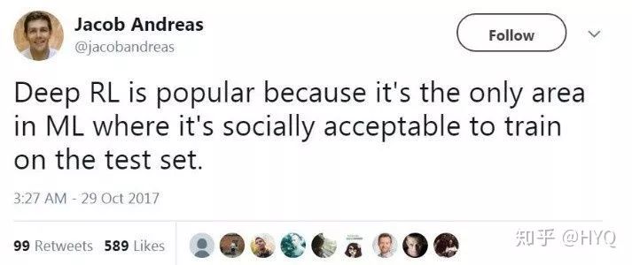 很多著名学者也纷纷加入讨论。目前普遍的观点是,DRL可能有AI领域最大的泡沫。机器学习专家Jacob Andreas发了一条意味深长的tweet说: