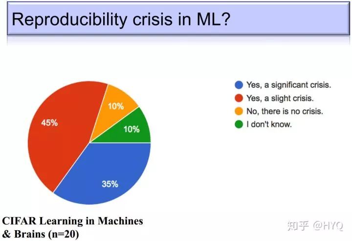 12月,在万众瞩目的NIPS 2017 DRL专题研讨会上,Joelle Pineau受邀作了题为“Reproducibility of DRL and Beyond”的报告[11]。报告中,Pineau先介绍了当前科研领域的“可复现性危机” :在《自然》杂志的一项调查中,90%的被访者认为“可复现性”问题是科研领域存在的危机,其中,52%的被访者认为这个问题很严重。在另一项调查中,不同领域的研究者几乎都有很高的比例无法复现他人甚至自己过去的实验。可见“可复现性危机”有多么严峻!Pineau针对机器学习领域发起的一项调研显示,同样有90%的研究者认识到了这个危机。