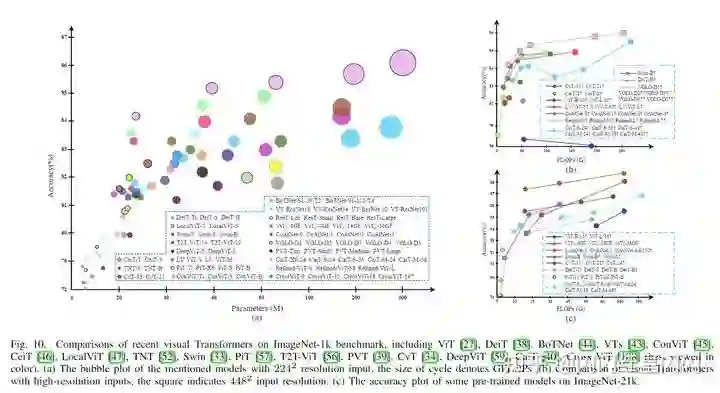 根据本文的分类法,所综述的监督模型可分为六类。表一总结了 Transformer 在主流分类基准上的分类性能,并为每个型号指定了专用颜色。为了客观直观地评估它们,以下三幅图说明了它们在不同配置下在 ImageNet-1k 上的比较(例如,模型大小、FLOPs 和训练方案)。下图总结了在 输入分辨率下,每个模型的性能。由于 FLOPs 在 Transformer 内随输入大小呈二次增长,下图(b)将 FLOPs 作为水平轴,重点关注其在更高分辨率下的性能。下图(c)重点介绍带有外部数据集的预训练模型。根据这些图,作者简要分析了有利于模型性能、效率和可扩展性的几项改进,如下所示: