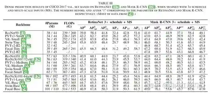 作者在本文中回顾了许多用于图像分类的基于 Transformer 的主干。这些主干可以很容易地合并到各种框架中(例如,MaskR-CNN、RetinaNet、DETR 等)来执行密集预测任务。除了一般的改进外,它们中的一部分也有利于改进密集预测任务。层次结构将 Transformer 构造为一个从高分辨率到低分辨率的过程来学习多尺度特征,如 PVT。局部增强结构将主干构建为局部到全局的组合,以有效地提取短程和长程的视觉依赖性并避免二次计算开销,例如 Swin-Transformer、ViL 和 Focal Transformer。下表3在密集预测任务中比较了基于视觉 Transformer 框架的模型。基于 Transformer 的主干比当前 CNN 模型的性能高 2-6.8%,这证明了 Transformer 在密集预测方面的有效性。