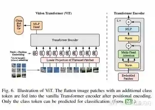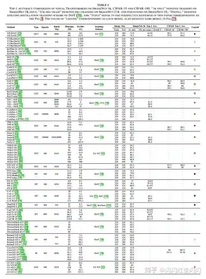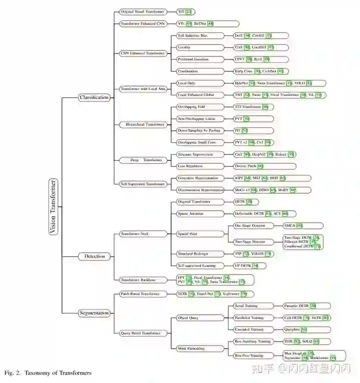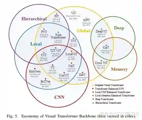受到在 NLP 中 Transformer 优异发展的启发,一些研究人员试图将 Transformer 引入图像分类。与传统CNN相比,Vision Transformer(ViT)首次在主流分类基准上实现了类似甚至更高的性能。本节全面回顾了 2021 年 6 月之前发布的 40 多个 Transformer 主干,并根据其动机和实现将它们分为六类,如下图 5 所示。