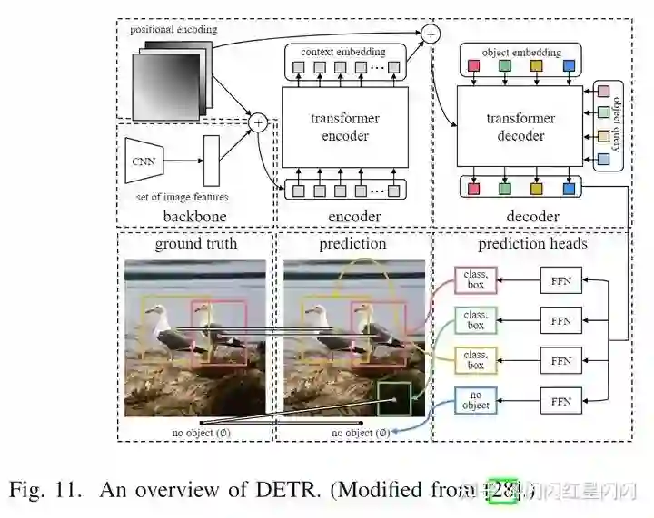 DETR是第一个端到端的 Transformer 检测器,它消除了手工设计的表示和非极大值抑制(NMS)后处理,通过引入目标查询和集合预测直接检测所有对象。具体地,DETR 使用编码器-解码器 Transformer 作为颈部,以及使用 FFN 作为预测头(如上图所示)。