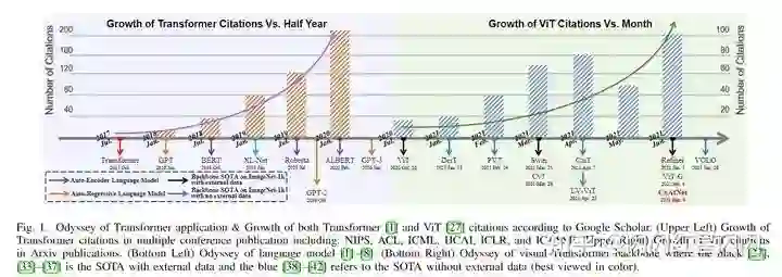 如上图左边所示,Transformer 逐渐成为自然语言处理 (NLP) 的主要深度学习模型。从上图右图所示,在过去的一年中,针对不同的领域提出了数百种基于 Transformer 的视觉模型。