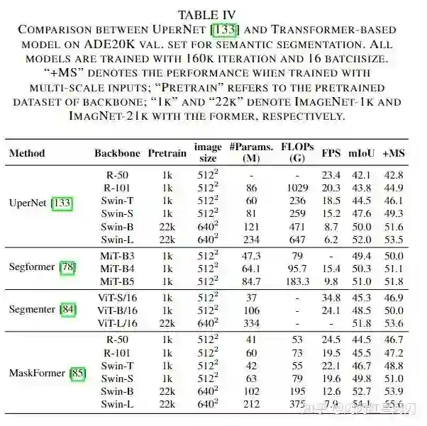 下表 4 侧重于语义分割任务的 ADE20K 验证集(170 个类别)。作者发现 Transformer 在有大量类而不是较小类的数据集上进行训练可以显示出巨大的性能改进。
