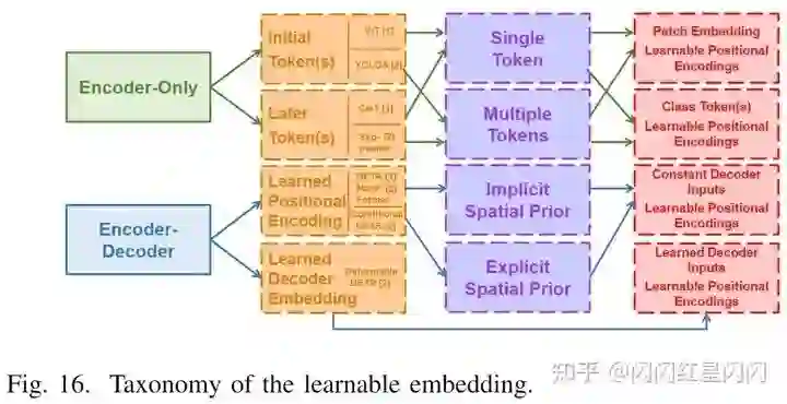 Transformer 模型采用可学习的嵌入来执行不同的视觉任务。从监督任务的角度来看,这些嵌入可以分为类标记、目标查询和掩码嵌入。从结构上看,它们之间是有内在联系的。最近的 Transformer 方法主要采用两种不同的模式:仅编码器结构和编码器-解码器结构。每个结构由三个层次的嵌入组成,如上图 10 所示。从位置层次,学习嵌入在仅编码器的 Transformer 中的应用被分解为初始令牌(initial token)和后期令牌(later token),而学习的位置编码和学习的解码器输入嵌入被应用于编码器-解码器结构。从数量层面来看,仅编码器的设计会应用不同数量的令牌。例如,ViT 家族和 YOLOS 将不同的数字标记附加到初始层,而 CaiT 和 Segmenter 利用这些标记来表示最后几层的不同特征。在编码器 - 解码器结构中,解码器的学习位置编码(目标查询或掩码嵌入)在显式 [28]、[137] 或隐式 [69] 中附加到解码器的输入中。与常数输入不同,Deformable DETR 采用学习嵌入作为输入并加入到编码器的输出。