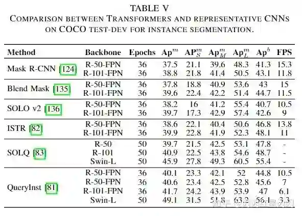 下表 5 侧重于评估实例分割任务的 COCO test-dev 2017 数据集。显然,带有掩码嵌入的 Transformer 在分割和检测任务中都超越了以往流行的模型。这些方法显著提高了 box 的准确率,但对分割只有轻微的改进,从而导致 和 的性能存在巨大差距。基于级联框架,QueryInst 在 Transformer 模型中获得了 SOTA 性能。因此,Transformer 与混合任务级联结构的结合值得进一步研究。