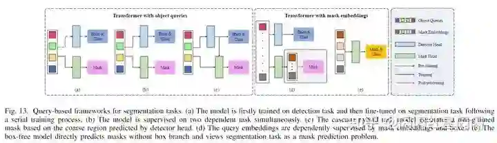 查询(Query)是 Transformer 解码器输入和输出处的一个可学习的嵌入。与 patch 嵌入相比,查询嵌入可以更“公平”地整合每个 patch 的信息。有着集合预测损失的基于查询的 Transformer 能够删除其他手工制作的表示和后处理。最近,许多努力试图将这种表示推广到可以分为两类的分割任务。一类框架是由检测任务监督的目标查询所驱动。另一类的查询仅由分割任务监督,称为掩码嵌入。