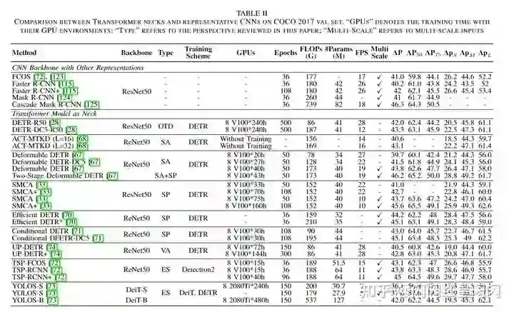 本节在表2和表3中简要比较和分析了 Transformer 检测器。对于 Transformer 颈,本文只关注它们在单尺度特征结构中的 FLOPs,而不是多尺度特征,因为它们应用了不同的层数。从稀疏注意力(SA)的角度来看,Deformable DETR 减少了 8 GFLOPs 并缩短了 12 倍的训练时间,而 ACT-DC5 将计算成本从 187 GFLOPs 降低到 156 GFLOPs,并且性能损失很小。从空间先验(SP)的角度来看,one-stage 检测器显示地将空间先验与目标查询分开,带来快速收敛和高精度。SMCA 和 Conditional DETR 在 108 个训练 epoch 时分别达到了 42.7% 和 43% 的 mAP。two-stage 检测器和 TSP-RCNN 都用 proposals 替换了学习到的目标查询。这种本质上相同但结构上不同的方法显着提高了检测器的准确性。从多尺度 (MS) 特征的角度来看,它可以补偿 Transformer 在小物体检测上的性能。例如,Deformable DETR 和 SMCA 将 DETR 提高了 5.2% 和 3.1% 。仅编码器的结构减少了 Transformer 层数,但过度增加了 FLOPs,例如具有 537 GFLOPs 的 YOLOS-B。相比之下,编码器-解码器的结构是 GFLOPs 和层数之间的一个很好的权衡,但更深的解码器层可能会导致长时间的训练过程和过度平滑的问题。因此,将 SA 集成到具有 MS 和 SP 的深度解码器中值得进一步研究。