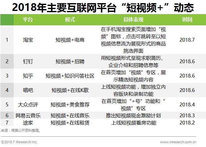 进入2018年之后,市场上“短视频+”的模式有了更加亮眼的表现,一方面,早期玩家不断深化平台短视频功能,如7月手机淘宝推出短视频信息流的商品搜索展示页面,从内容层面的短视频探索向功能层面的短视频布局深化;另一方面,以知乎、钉钉校招等产品为代表的不同领域产品也纷纷找到了“短视频+”的切入点,相继上线短视频相关功能,探索“短视频+”新玩法。