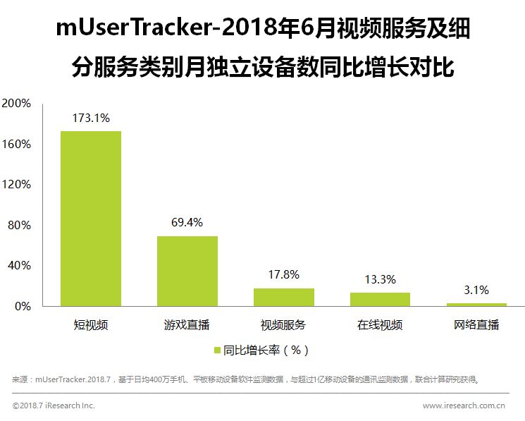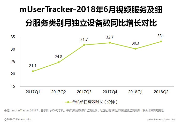 当前短视频行业可以说一半是海水,一半是火焰。2016年以来,短视频行业持续升温,不论平台、资本还是用户,各方热情都从未减退。艾瑞移动用户行为监测产品mUserTracker数据显示,2018年6月短视频行业月独立设备数的同比增长率高达173.1%,在所有视频服务的细分类别中遥遥领先,而同期视频服务整体的月独立设备数同比增长率仅为17.8%。从触媒习惯来看,用户投入在短视频上的时间也保持不断增长的态势,单机单日有效使用时长已经从2017年第一季度的21.1分钟增长到2018年第二季度的33.1分钟。短视频行业在快速发展的同时伴随着巨大的商业价值和想象空间,也吸引着越来越多的玩家从观望到入局,抢夺行业快速发展期的红利。