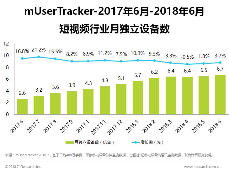 另一方面,经过两年时间的野蛮生长,短视频行业已经从蓝海变成了红海。艾瑞移动用户行为监测产品mUserTracker数据显示,进入2018年以来,短视频行业月独立设备数的环比增长率逐渐放缓,短视频行业用户红利期已经开始消退,2018年6月短视频月独立设备数环比增长仅为3.7%。在用户红利期消退和短视频媒体平台竞争白热化的背景下,对于想要再入局的新玩家显然提出了更高的门槛和要求,以及将承担更大的风险。因此,对于绝大部分新玩家来说,通过“短视频+”的方式在已有平台上搭建和嵌入短视频功能,不失为一个曲线救国的入局途径。同时,随着短视频行业的规范化和成熟化,各方玩家面对短视频也更加理智,相对于盲目进场,寻找与短视频融合的新形式和新机会,成为其更加关注的方向。