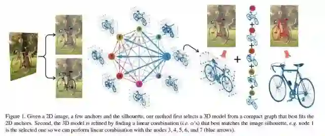 对于一个特定对象的二维图片,算法通过2D锚点和轮廓信息来估计相机位姿和三维网格模型。作者假设锚点和轮廓信息是之前已经知道的。作者首先构建一个图结构,然后从图中选择一个轮廓匹配度最好的三维模型。然后基于稠密映射和图片轮廓对三维模型进行精细化。
