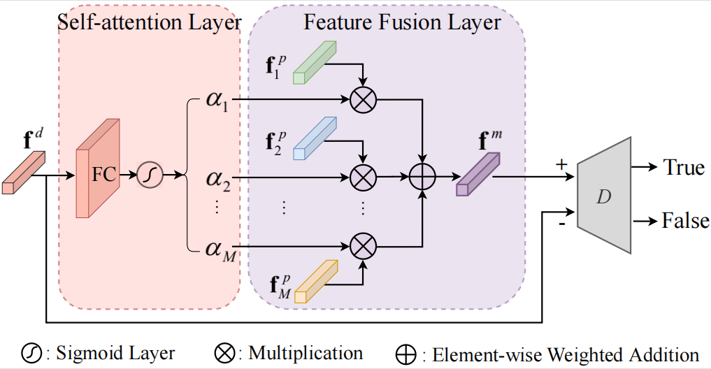 如图2所示,ADFL的网络结构由自注意力(SA)层、特征融合层和判别器组成。假设将一张无干扰标签的人脸表情图像输入到ADDM和DFEM中,此时,