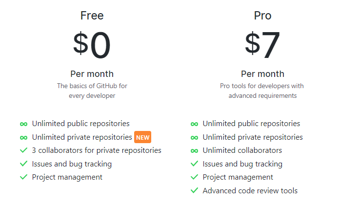Github官网上,目前面对个人用户的无限容量免费版服务已经上线。免费版服务将合作者数量限制为最多3人。