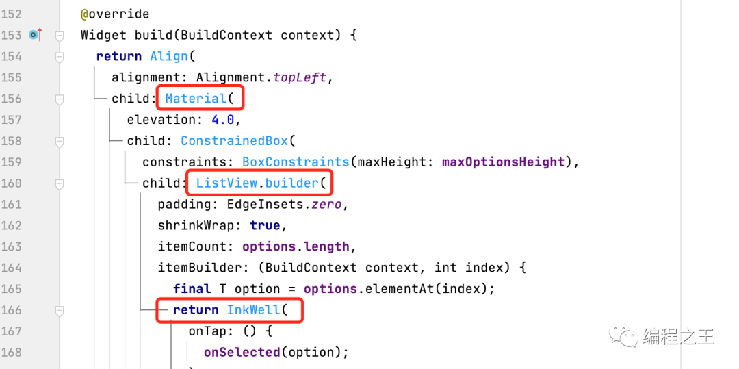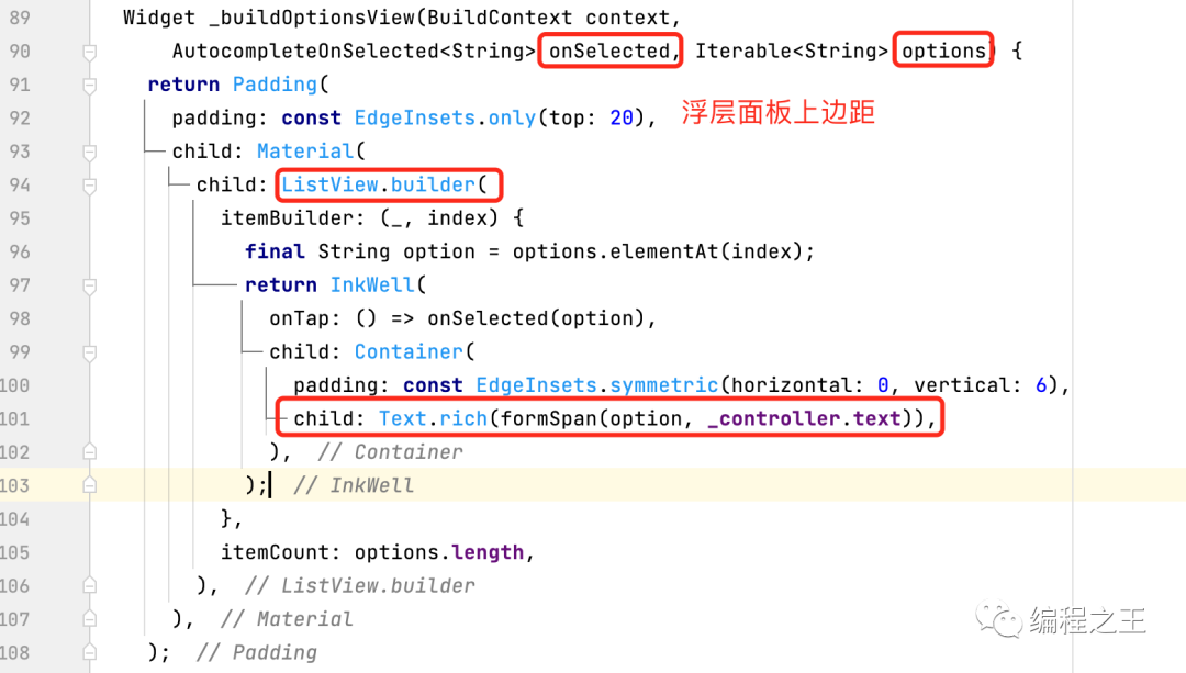 如下是 _buildOptionsView 方法的实现,其中会回调 onSelected 回调函数,和 options 数据,我们需要做的就是依靠数据,构建组件进行展示即可。另外,默认浮层面板和输入框底部平齐,可以通过 Padding 进行下移。另外,由于是浮层,展示文字时,上面需要嵌套 Material 组件。