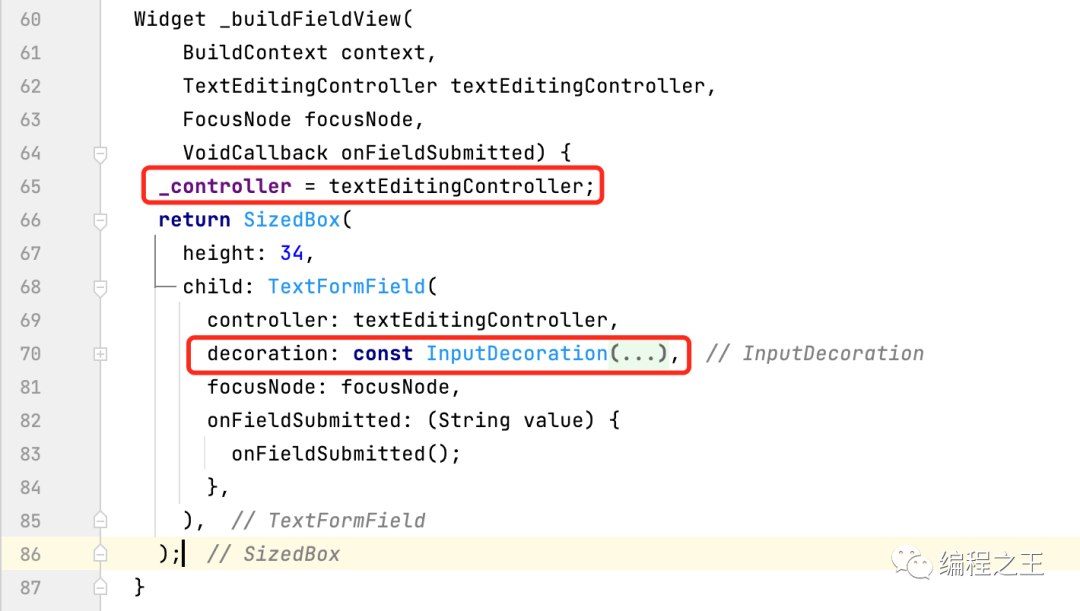 另外,对于输入框的构建,通过如下的 _buildFieldView 实现,其中有 _controller 记录一下 TextEditingController,是因为 optionsViewBuilder 回调中并没有回调输入的 arg 字符,所以想要输入的关键字高亮,只能出此下策。这样,在 TextFormField 构建时,您可以指定自己需要的装饰。