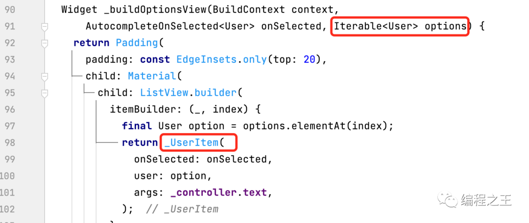 这样在 _buildOptionsView 中,回调的就是 User 的可迭代对象。如下,封装一个 _UserItem 组件,对条目进行显示。