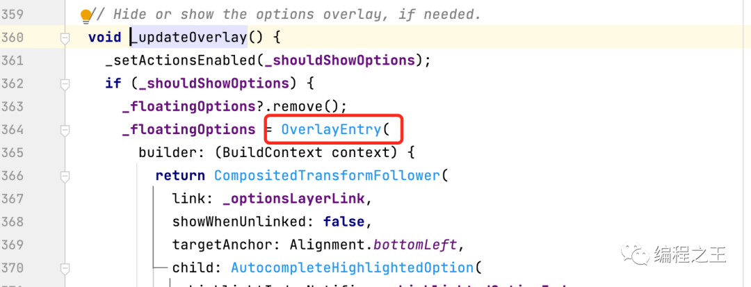 对 Autocomplete 来说,只是 RawAutocomplete 套了个马甲,本质上的功能还是在 RawAutocomplete 的状态类中完成的。如下是 _RawAutocompleteState 的部分代码,可以看出这里的浮层面板,是通过 Overlay 实现的,另外通过 CompositedTransformTarget 和 CompositedTransformFollower 对浮层进行定位。