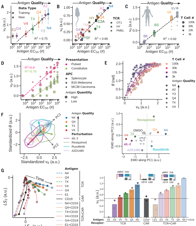 ( A ) 在所有 OT-1 抗原上测试隐空间的数学模型得到与它们的等级相关的v 0测量值(由功能性剂量反应的 EC 50定义。(B到D)从OT-1 T细胞中学习的抗原编码产生准确的v 0排序与不同的小鼠TCR转基因T细胞(B)人类TCR转基因T细胞(C)和OT-1 T细胞响应组成性表达抗原的肿瘤 (D)。( E ) 抗原编码在 ( v 0 ,θ) 空间。( F ) 左:抗原编码 ( v 0 ,θ)在各种分子扰动下的 T 细胞活化。右图:单个抗原的Earth mover’s distance(EMD)。PC1 捕获抗原质量的变化 (EMD2 = 0)。尽管大多数分子扰动只是降低了表观抗原性(EMD1 < 0,EMD2 ≈ 0),但 JAK 抑制剂(AZD1480 和 ruxolitinib)严重影响 T 细胞活化(EMD2 < 0),而 TLR7/8 激动剂瑞喹莫特增强了它(EMD2 > 0) . ( G ) 抗 CD19 CAR-T 细胞(左)的抗原编码揭示了细胞因子反应的弱激活和拮抗模式(右)。