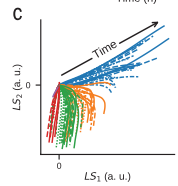 作者使用有两个节点的二维编码(LS1,LS2)学习框架对抗原质量分类。通过训练后,将数据投影到一个2维编码(LS1,LS2)的隐空间,五维(5D)细胞因子时间过程被压缩成二维轨迹。2D轨迹根据抗原序列可以很好地分离,并且与抗原数量无关。如下图C