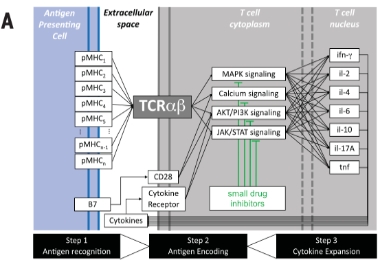 免疫反应是对时间有依赖性的。例如PD-1蛋白的表达与T细胞激活或衰竭相关,具体取决于时间和环境。这种复杂性源于多个配体(抗原)与单基因T细胞受体(TCR)结合触发的多变量反应。不同的小分子抑制剂的刺激会影响不同的细胞因子的激活模式(图A)。