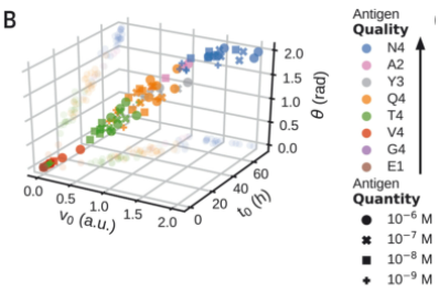 作者专注于模拟T细胞对靶蛋白上的抗原的应答,以机器人方式生成T细胞激活的高精度、多维度动力学数据,并应用监督机器学习来学习信息的动态编码。
