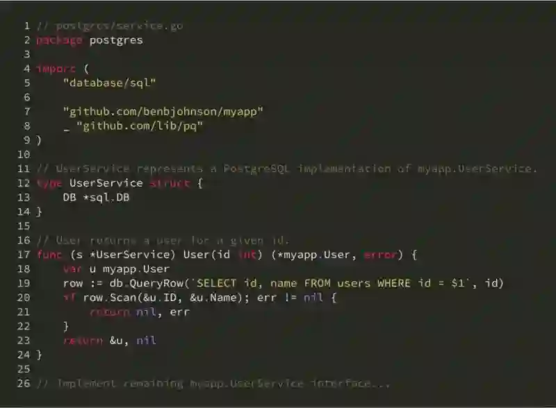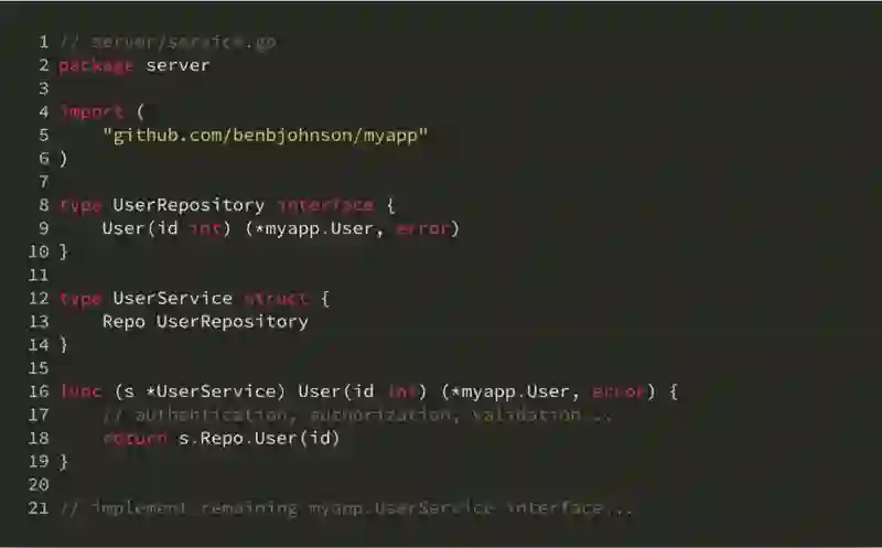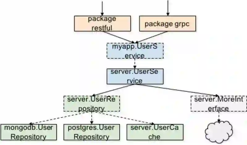 从 MVC 的角度看,这里的 UserService 属于 model 层次。在其上还有对接 HTTP API 的 view-controller 层。可以想象 view-controller 层需要依赖并利用 UserService,这里不再展开代码。这里的关键是,包的命名不再是 models 或这 controllers,而是按照外部依赖而命名。那么当包外引用 UserService 的时候,它的形式会是 postgres.UserService,非常简洁易理解。