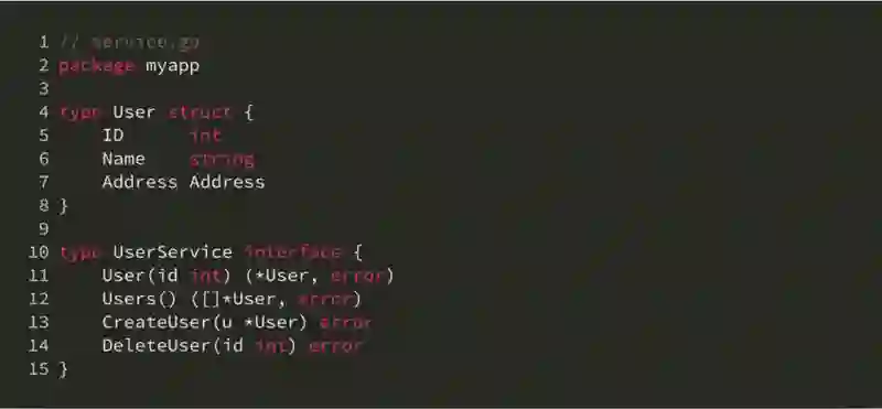 业务逻辑层的主要外部依赖是它所定义的一系列像 UserRepository 这样的外部接口。我们同样可以用 gomock 来为这些接口生成 mock 代码。