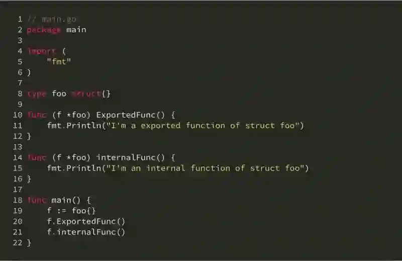 由于 C++ 具有类粒度的可见性,因此就算是和这个类实现在同一个源代码文件下,依然可以实现对类外隐藏内部实现,以达到代码封装的目的。那么再来看看 Golang。在下面的例子中,我们可以调用到 foo 结构体的内部函数 internalFunc,只要调用方和 foo 结构体在同一个 package 下: