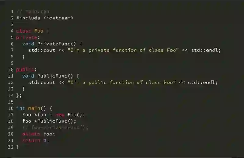 但是如果代码量稍大,或者存在团队协作情形的项目,这样的组织方式就暴露无法隐藏结构体内部实现的问题了。不同于 C++ 或 Java,Golang 的代码可见性的最小粒度是 package。例如在下面的 C++ 代码中,我们 Foo 类的外部是无法调用它的私有函数 PrivateFunc 的: