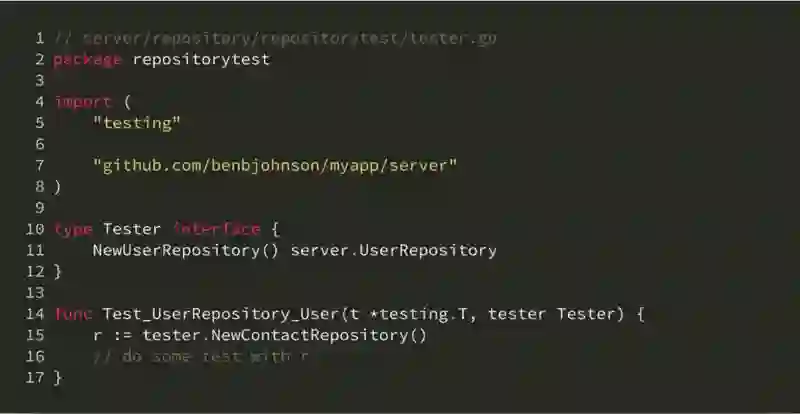 在这一层的集成测试中,我们主要关注它每个接口的功能是否正确,实际上是一种功能测试。例如 User 函数在给定某个已有用户的 id 时应能返回这个用户,而当给定的 id 不存在时,应返回适当的错误。不管接口的具体实现是怎么样的,从使用的角度它们应该具备一致的功能,因此对于同一个接口的不同实现,它们的集成测试样例可以共享。这就对应我们上面目录结构中的 repositorytest 包的作用,它包含了 UserRepository 通用的功能测试样例: