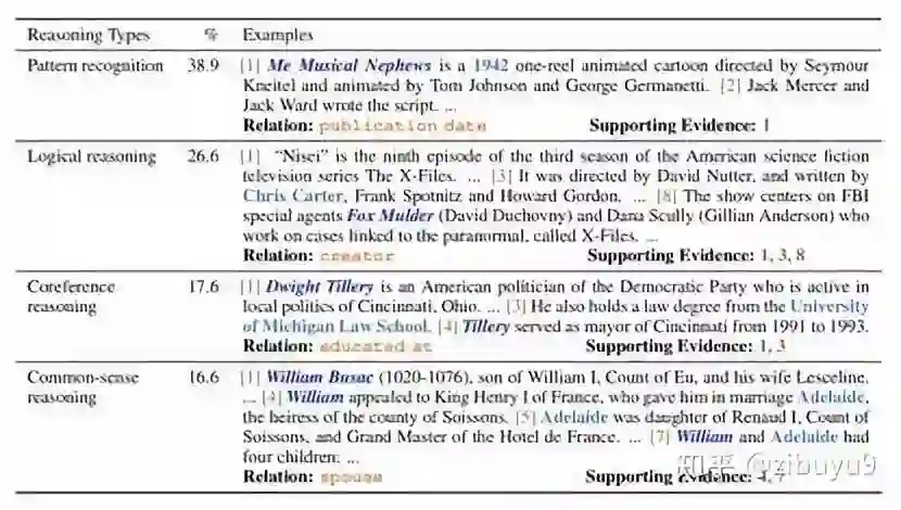 为了推动文档级关系抽取的研究,课题组姚远同学等 [30] 提出了 DocRED 数据集,是一个大规模的人工标注的文档级关系抽取数据集,基于维基百科正文和 WikiData 知识图谱构建而成,包含 5,053 篇维基百科文档,132,375 个实体和 53,554 个实体关系事实,是现有最大的人工标注的文档级关系抽取数据集。如下图所示,文档级关系抽取任务要求模型具有强大的模式识别、逻辑推理、指代推理和常识推理能力,这些方面都亟待更多长期的研究探索。