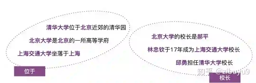 远程监督的思想并不复杂,具体来说:如果两个实体在知识图谱中被标记为某个关系,那么我们就认为同时包含这两个实体的所有句子也在表达这种关系。再以(清华大学,位于,北京)为例,我们会把同时包含「清华大学」和「北京」两个实体的所有句子,都视为「位于」这个关系的训练样例。