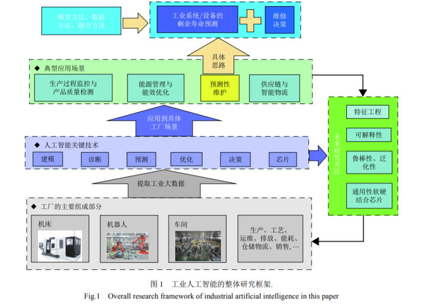 随着人工智能技术的快速发展及其在工业系统中卓有成效的应用, 工业智能化成为当前工业生产转型的一个重要 趋势. 论文提炼了工业人工智能 (Industrial artificial intelligence, IAI) 的建模、诊断、预测、优化、决策以及智能芯片等共性关 键技术, 总结了生产过程监控与产品质量检测等 4 个主要应用场景. 同时, 论文选择预测性维护作为工业人工智能的典型应 用场景, 以工业设备的闭环智能维护形式, 分别从模型方法、数据方法以及融合方法出发, 系统的总结和分析了设备的寿命 预测技术和维护决策理论, 展示了人工智能技术在促进工业生产安全、降本、增效、提质等方面的重要作用. 最后, 探讨了工 业人工智能研究所面临的问题以及未来的研究方向.