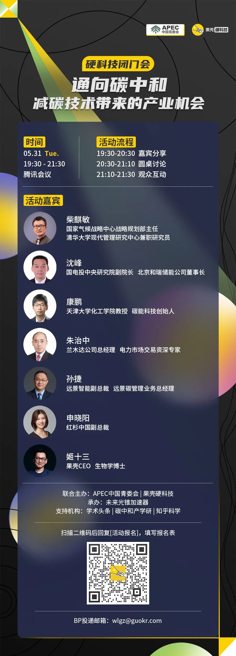 5月31日,APEC中国工商理事会青年企业家委员会联合果壳硬科技,将举办主题为“通向碳中和——减碳技术带来的产业机会”的线上闭门会,邀请碳中和领域专家和产业伙伴,探讨绿色减碳技术的发展路径,以及资本、政策等条件对减碳技术的影响,共同推进碳中和愿景实现。
