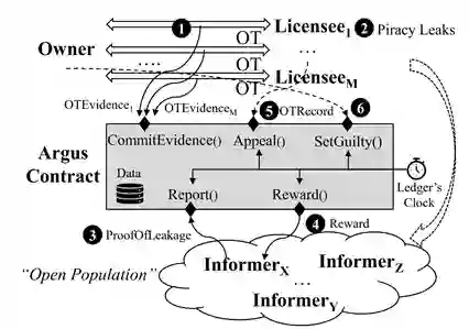 Argus 系统的安全性则来自于各种密码学协议的性质以及各参与方的利益驱使。Argus 系统可以保护各善良参与方的利益不受影响,例如 owner 希望通过 Argus 评估盗版传播情况是准确的;licensee 希望不被 owner 诬陷;informer 希望获得最多奖励等等。为了达到这样的安全性,Argus 系统使用了安全水印技术(Secure Watermarking)来对恶意的 licensee 进行溯源;用不经意传播协议(Oblivious Transfer)来防止 owner 诬陷,因而提高了指控 licensee 的证据力度;用多周期承诺方案(Multi-period Commitment Scheme)来防止 informer 实施重放攻击,以及防止 informer 利用“一人多身份骗术”重复举报不正当获利(Sybil-proof Incentive Mechanism)。