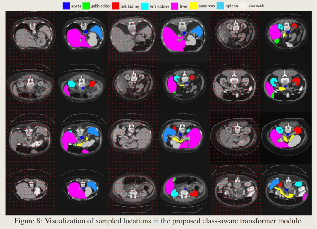 这里箭头初始点是初始取样位置(p1),箭头的终端是最终取样点位置(p4)。通过可视化可以发现取样点的偏移方向倾向于高度语义相关的地区,这也证明了 CAT 模块的有效性。
