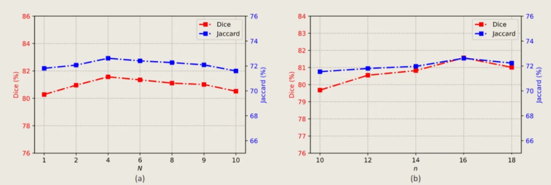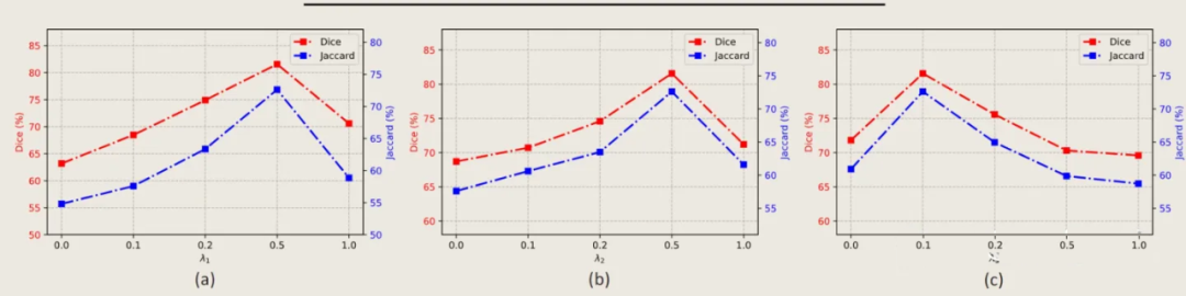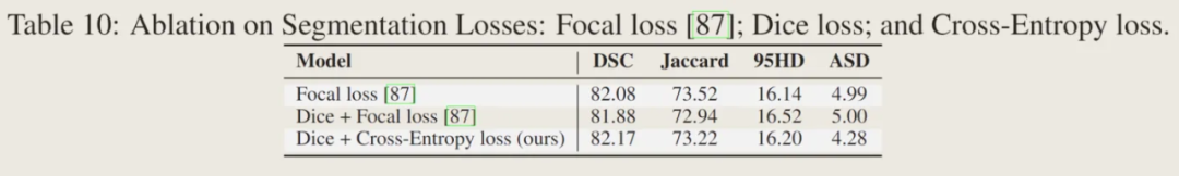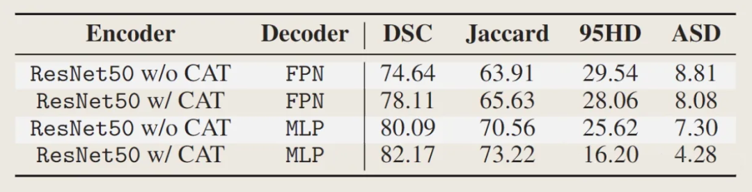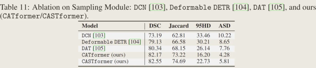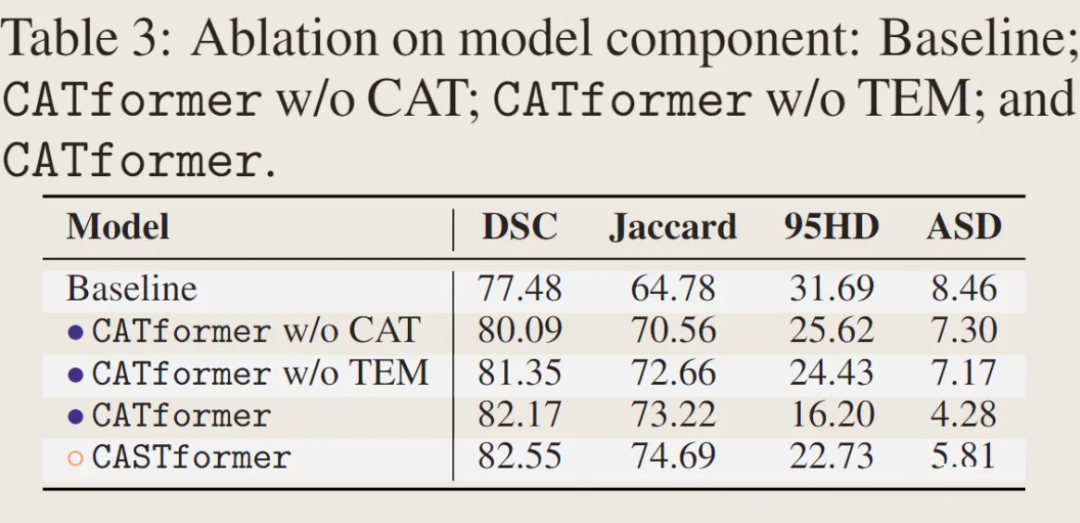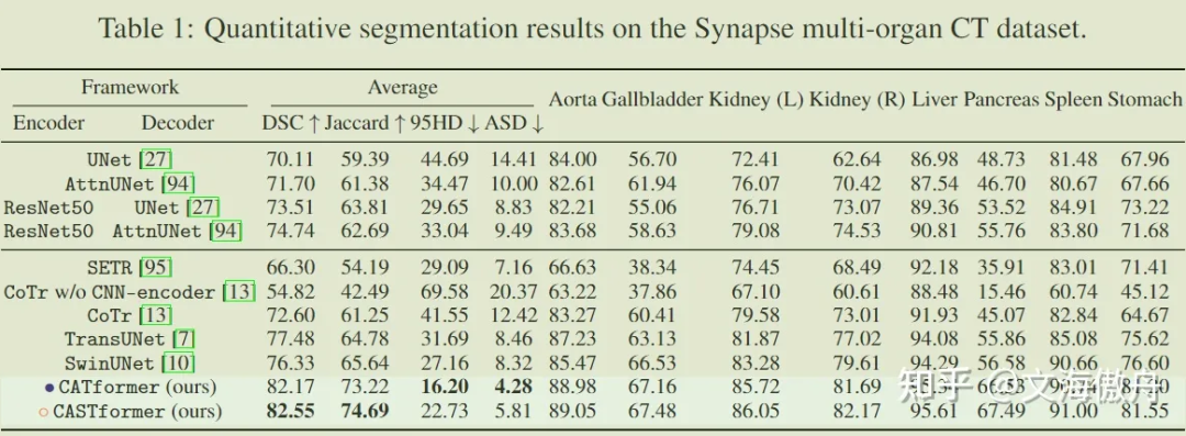 可以发现在所有框架比较中,CATformer 和 CASTformer 都取得比其他网络框架更好的效果。这里有趣的是 CATformer 和 CASTformer 的比较,CATformer 的DSC 和 Jaccard效果比 CASTformer 好,但在 95HD 和 ASD 标准处却不如CASTformer。这里我猜测,相较于 CATformer,CASTformer 使用了 GAN 的训练方式,在损失函数处使用了 DICE Loss,该损失标准偏向于内部重叠而忽略了边缘部分,导致使用了 GAN 网络训练方式在内部重叠标准处取得了较好结果,但在边缘处反而效果有所下降。
