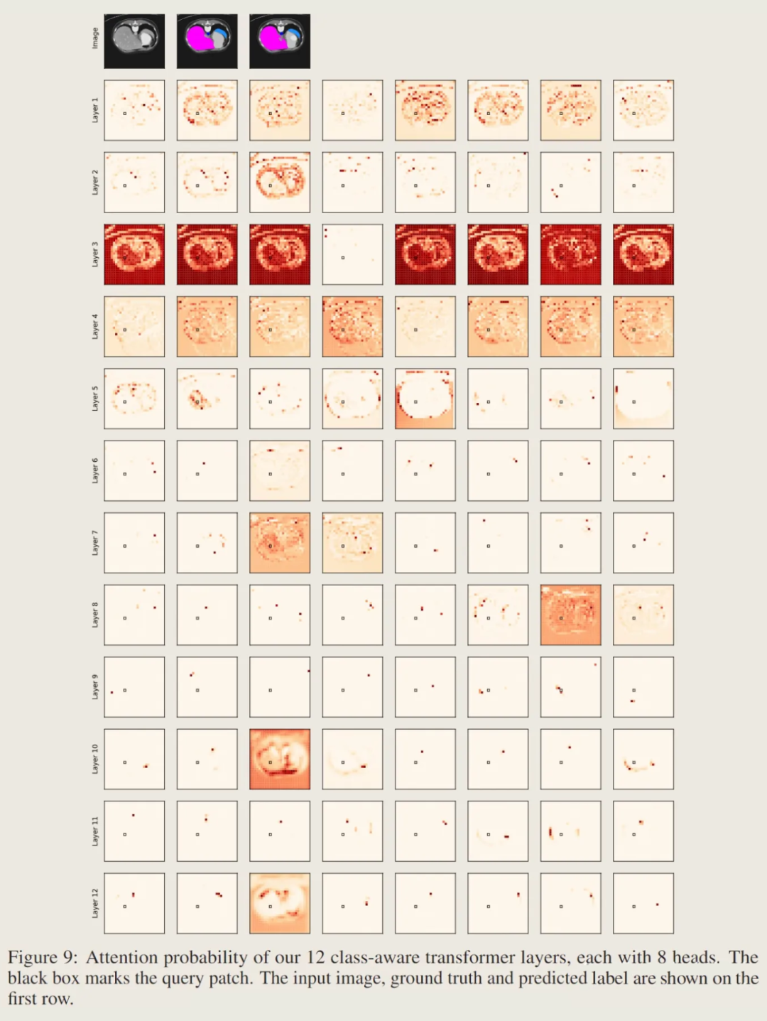 这里是注意力分布概率的可视化结果。注意力分布概率表示是 query patch 和 key patch 点积的 Softmax 结果分布,这里可以表示其他 patch 与 Query patch 的联系关系。