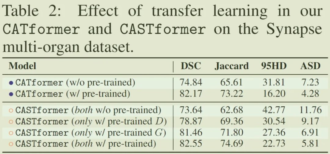 可以看到在使用 pre-trained 的模块在各个衡量标准上都起到较好效果,尤其在 CASTformer 中对 G、D 的消融实验中可以看到仅对 D 进行预训练也可以提升准确率,这说明 D 部分对更好利用语义信息起到促进作用。