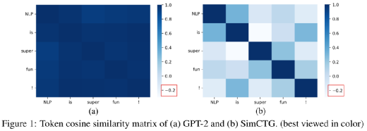 在理想情况下,模型的 token 表示应遵循各向同性分布,即 token 相似度矩阵应是稀疏的,不同 token 的表示应是有区别的,如图2(b)所示。在解码过程中,为了避免模型退化,需要保留生成文本的 token 相似矩阵的稀疏性。
