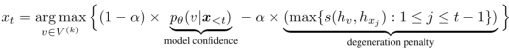其中 V(k) 是候选词集合,k 通常取 3 到 10。上式的第一项代表模型对 v 的支持度 v(model confidence),是模型估计的候选词 v 为下一个词的概率。第二项是对模型退化的惩罚项(degeneration penalty)是下一个词 v 与前面已生成的词的相似度最大值。α 是超参数,负责调节两项损失之间的平衡。当 α=0 时,解码方法退化到贪婪搜索。