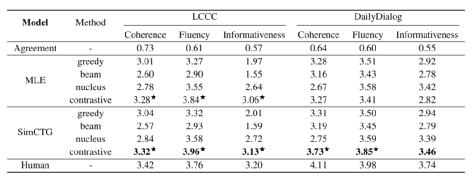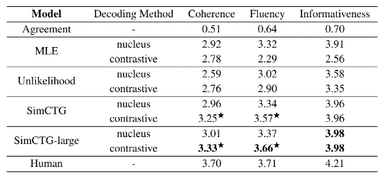 此外,从 MLE 和 Unlikelihood 基线的结果来看,对比搜索仍然比贪婪搜索和 beam 搜索带来了额外的性能提升。然而,对比训练的性能提高仍然滞后于 SimCTG,这说明了对比训练的必要性。一个可能的原因是,没有对比损失 LCL,MLE 或 unlikelihood 训练出来的 token 表示不具备充分的可区分性。因此,不同候选对象的退化惩罚不易区分,输出的选择受模型置信度的影响,使得对比搜索的有效性降低。