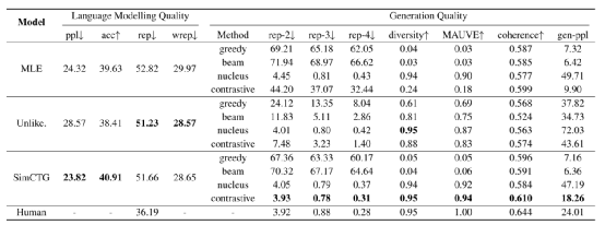 语言建模质量 从结果来看,SimCTG 获得了最好的困惑度和下一个 token 预测准确率。因为其使用了更有区分度的分布式表示,SimCTG 在进行下一个 token 预测时更不容易混淆,从而提高了模型性能。在 rep 和 wrep 度量上,非似然模型产生了最好的结果,但代价是复杂性和下一个 token 预测准确性方面的性能下降。