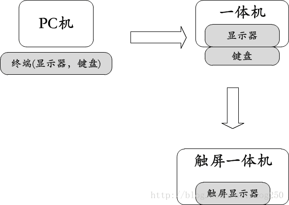 到了个人计算机时代,计算机和终端又成了一对一的关系。毕竟嘛,这时的计算机叫做个人计算机,并不是随便谁都能用的,计算机本身就是归属个人,所以根本没必要去支持什么多用户,或者至少是淡化了多用户和多终端的概念。我们都曾记得,当时买电脑的时候,都是一个主机配一个显示器和一套键盘鼠标,这种情况从上世纪80年代初一直持续到今天。不过近些年来当人们逐渐全面认识到计算机和终端的一对一关系后,一体机的市场就来了,既然你几乎不会(我当然知道有人会,但这里我说的是大多数人,程序员占比寥寥,程序员为了装X,是不会用一体机的,就连品牌机套装有时也不屑的)在同一主机上接多个显示器多套键盘,何必再那么麻烦,干脆把主机和显示器合在一起不就好了嘛。嗯,这个点子不错,循着这个路子,最终有了触屏一体机,连键盘都内置了。对比一下下图和三车间里的计算机时代,是不是很像呢?