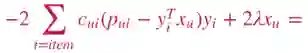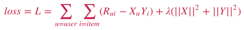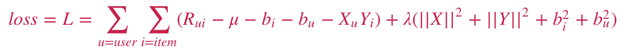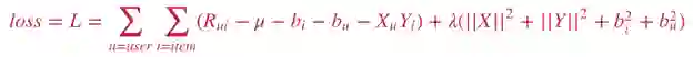 其中,R是已知的用户对物品的评分,X是用户的latent factor,Y是物品的latent factor,lambda是正则化系数。更复杂的加入了用户和物品偏置项的模型可以表达为: