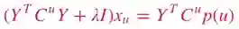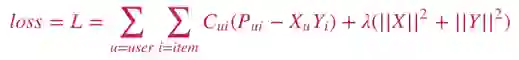 在论文Collaborative Filtering for Implicit Feedback Datasets [2] 中叙述的weighted alternating least squares模型是一种非常经典地处理implicit feedback的方法。这个方法与上述处理explicit feedback最大的不同之处是,这种方法将所有的用户与物品的交互都视为positive sample,用户与物品交互的次数反映了用户这个物品感兴趣的程度 (confidence)。这个模型可以被表示为: