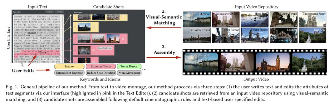 剪辑过程分为三个步骤:(1)用户提供输入,大部分时候是编辑文本;(2)系统自动搜寻视频库中语义匹配的镜头;(3)拼接视频。分割文本和镜头之间的视觉-语义匹配是通过级联关键词匹配和视觉-语义嵌入来实现的,比其他解决方案准确率要高。考虑到时间限制,视频重组被定义为对镜头、摄像机运动和色调等电影技术指标以及用户指定的电影技术习惯用法(cinematographic idiom)的混合优化。
