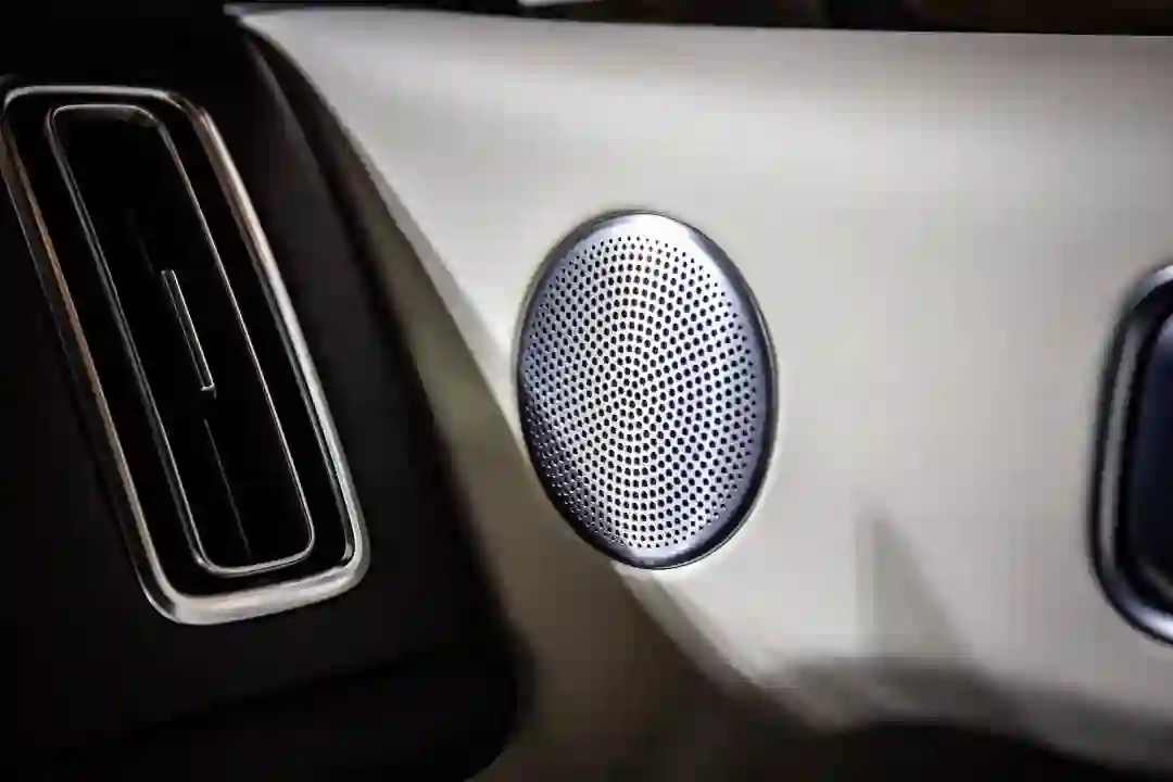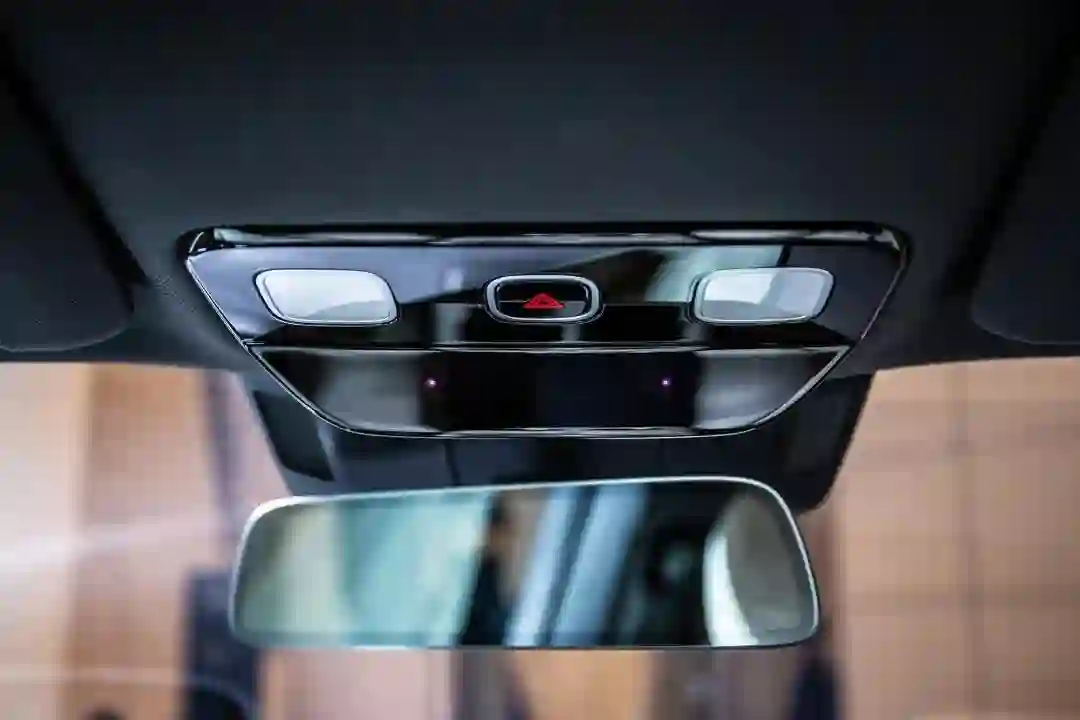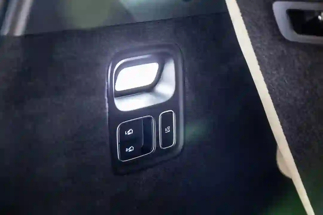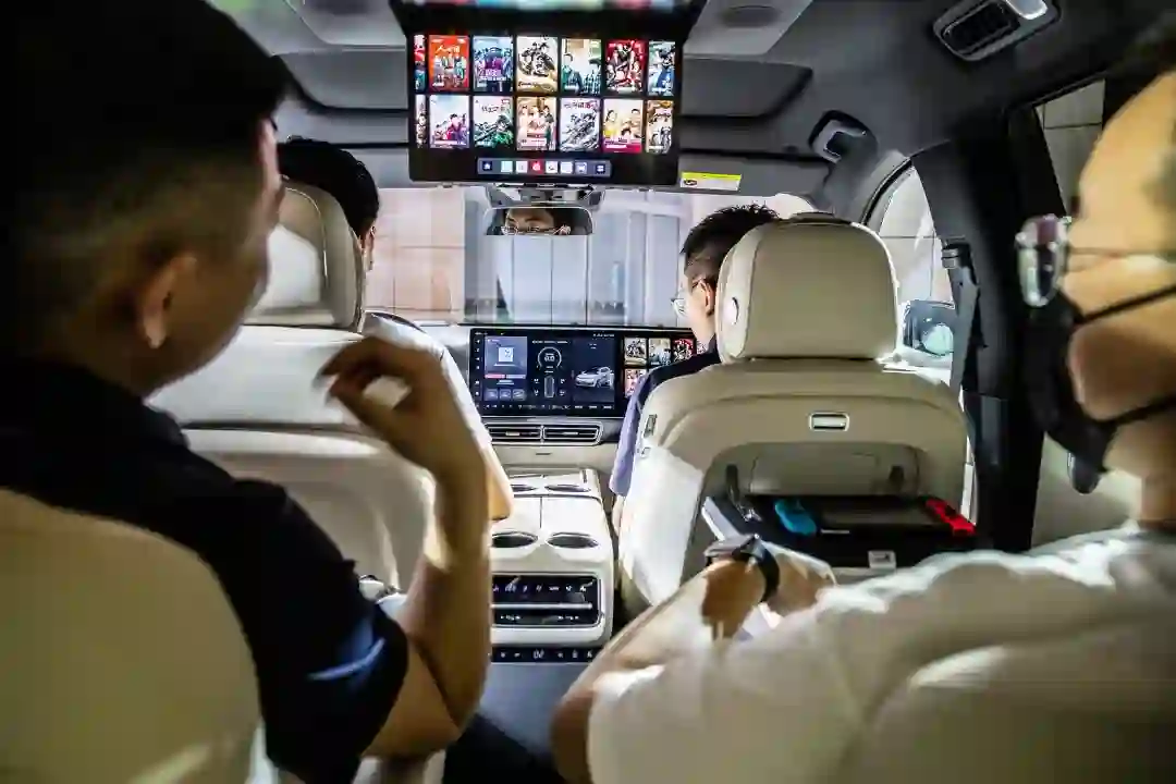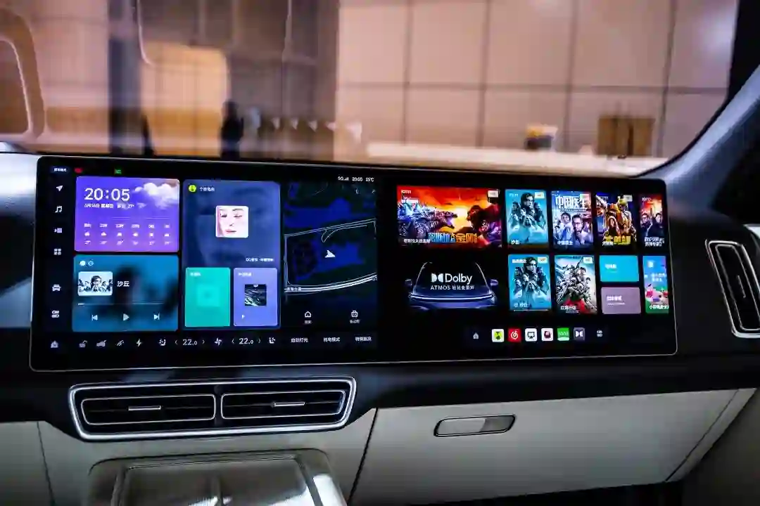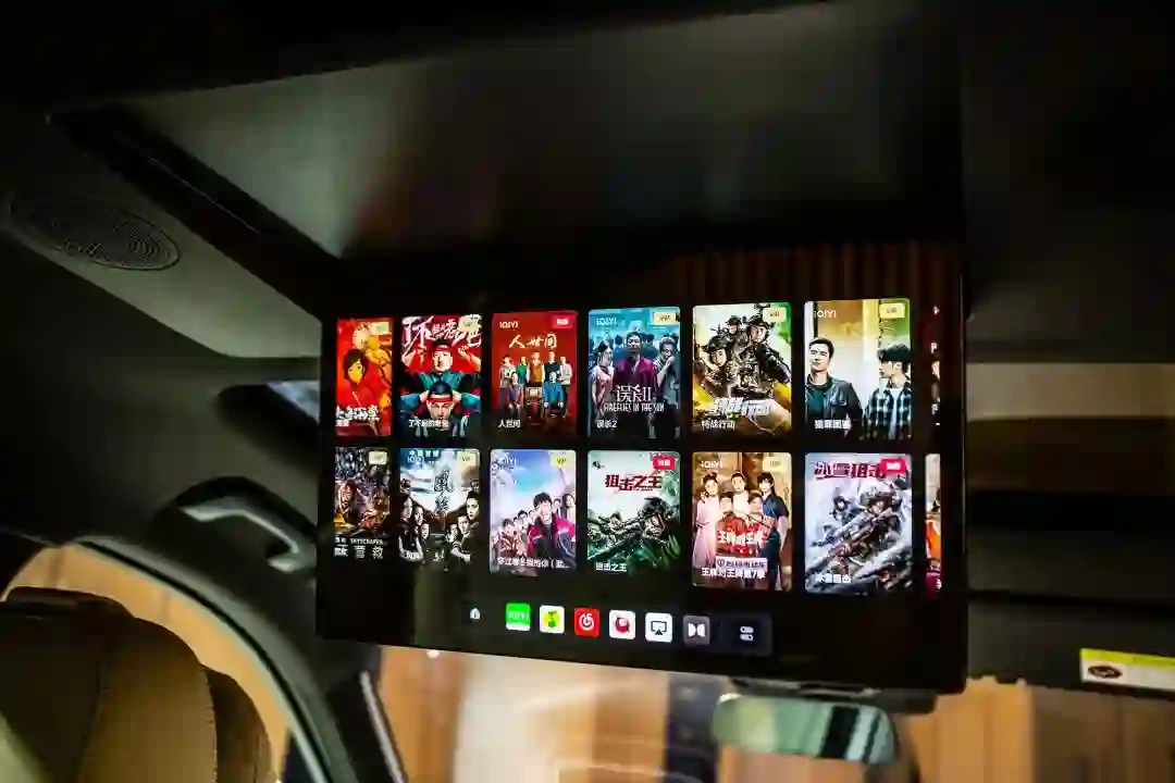 第二、三排乘客的影音娱乐体验,交由悬在车顶的电动折叠 15.7 英寸屏幕完成。全车三块 15.7 英寸的屏幕是互相打通的,内容共享只需长按内容卡片,再用屏幕手势一滑,搞定。